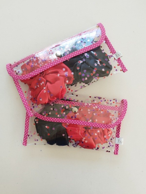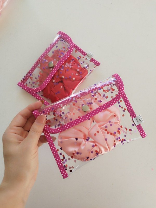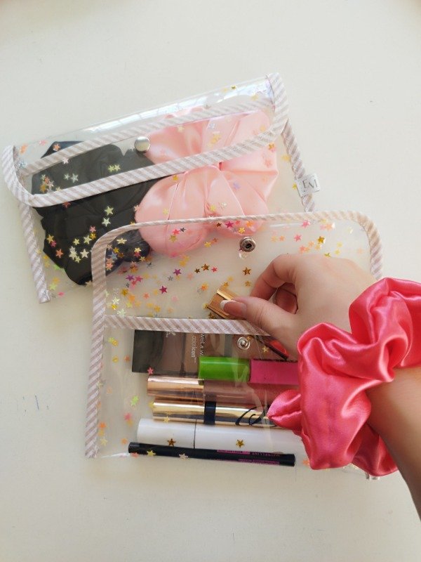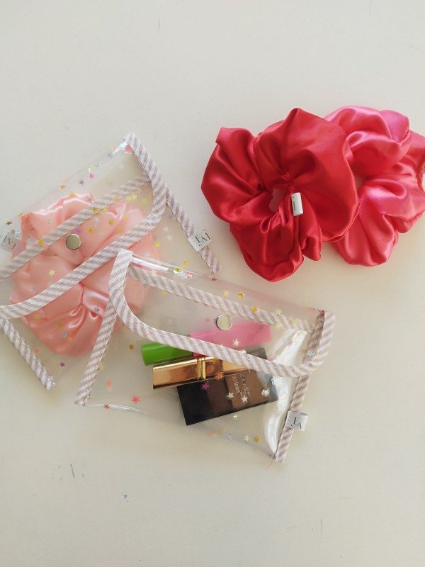 El set incluye un sobre tipo neceser y uno dos colines scrunchie, depende del modelo que elijas al seleccionar y agregar a carrito.